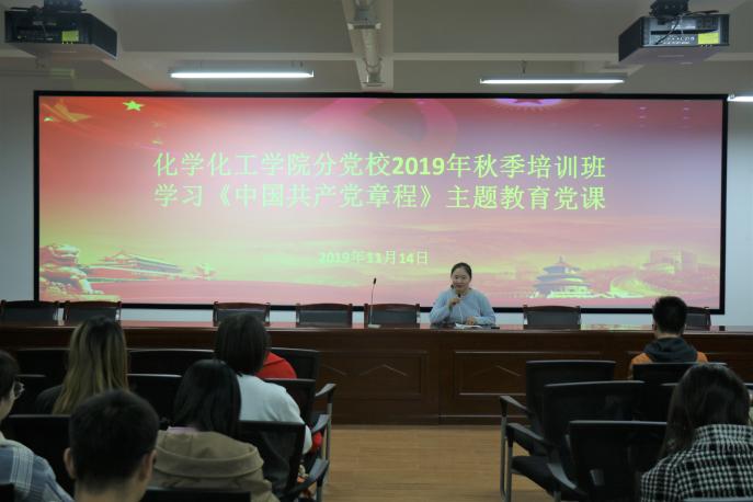 分党校2019年秋季培训班开展《中国共产党章程》党课培训学习。本次培训由化学工艺学生支部书记马洁老师主讲,全体入党积极分子和发展对象参加。