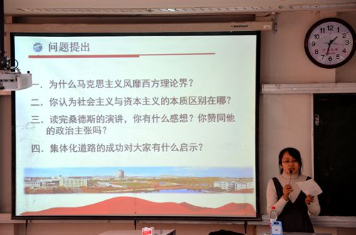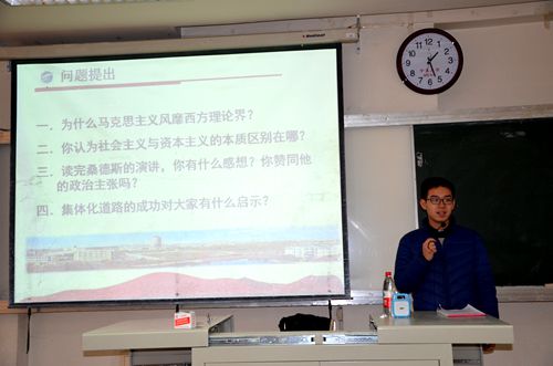 本次党课主要采取分组讨论的形式,奥部长先将积极分子分为若干小组,再组织大家阅读相关材料,并提出问题引导同学们积极思考。大家围绕“为什么马克思主义风靡西方理论界?”、“你认为社会主义与资本主义的本质区别在哪?”、“读完桑德斯的演讲,你有什么感想,你赞同他的政治主张吗?”及“集体化道路的成功对大家有什么启示?”这四个问题进行讨论。经过激烈的讨论,每个小组选出一位代表,对讨论结果进行发言。各小组联系中国国情,剖析社会主义和资本主义的实质,分析人权问题在社会主义和资本主义中的区别,对于四个问题给出了精彩、新颖的见解。而后,奥部长对大家的发言进行点评,对学院入党积极分子独特的见解以及新颖的看法给予了肯定,并鼓励大家今后遇到问题要有自己的思考,运用发散性思维,从不同角度看待问题,从而看到问题的实质,找到解决问题的方法。