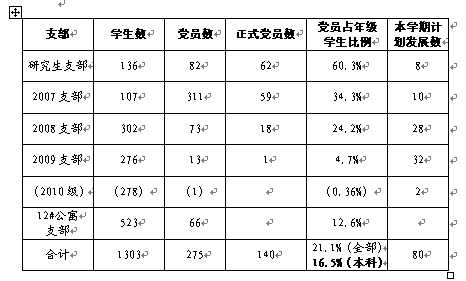1、支部的组织建设。2010级没有支部,研究生党员比例占60%,党员的作用发挥不够,建议成立2010级党支部(研究生和本科生2010级合并),将研究生党支部建在学点(需成立5个研究生支部);成立教工一支部(化学系)和教工二支部(应化和化工系)。