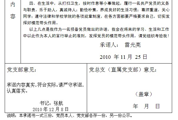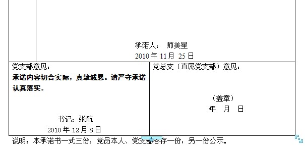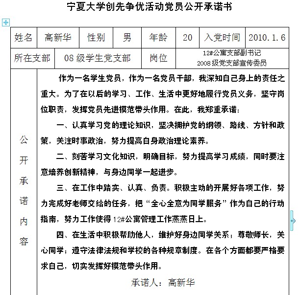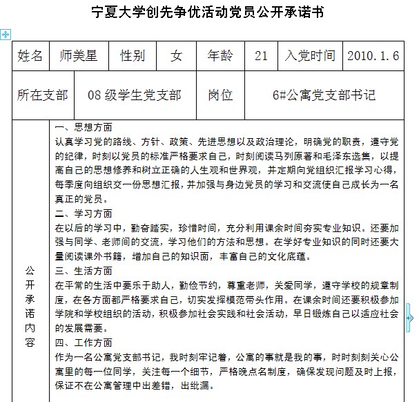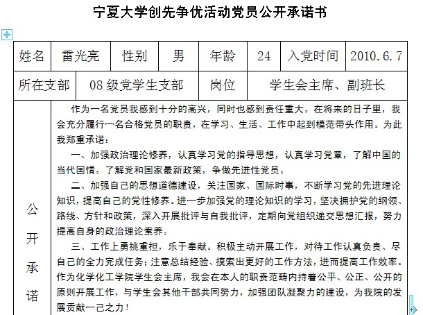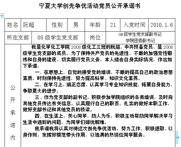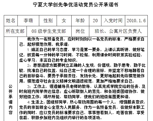 宁夏大学创先争优活动党员公开承诺书(2008级党支部)