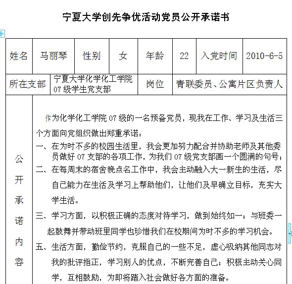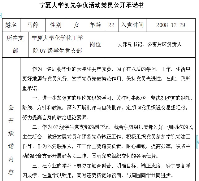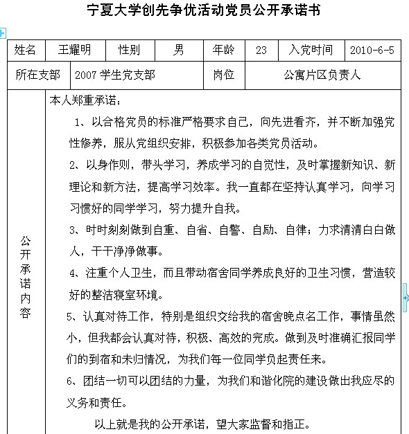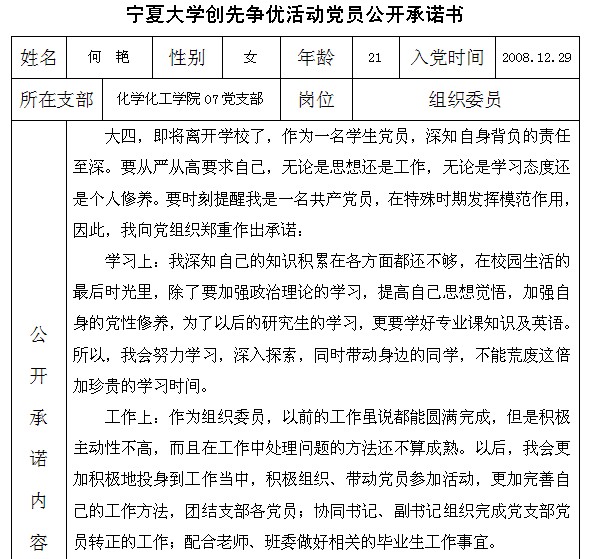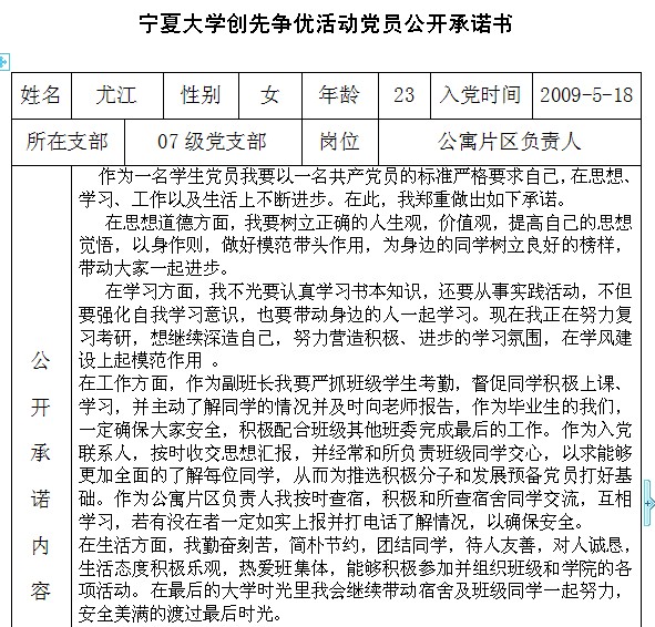 宁夏大学创先争优活动党员公开承诺书(2007级党支部)