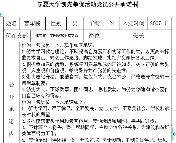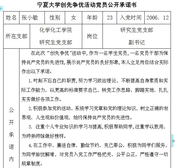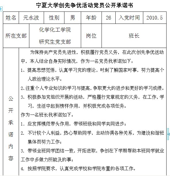 宁夏大学创先争优活动党员公开承诺书(研究生党支部)