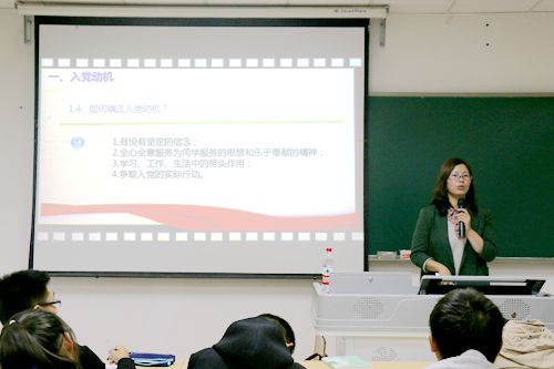 王老师先从入党动机、入党经历、入党程序和入党申请材料等方面为新生做了详细解读,运用优秀榜样的事例,向大家阐述了党员角色定位,并向大家推荐“共产党员”的微信公众号,以便大家对共产党员进行深入了解。最后,王老师特别强调了学习成绩的重要性,告诫同学们要明白党的事业发展需要青年,青年的成长离不开党的正确领导,大家要努力学习争取早日入党,成为合格的共产主义接班人。