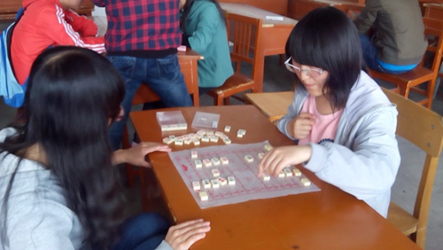 此次比赛项目有中国象棋,暗翻军棋和五子棋,比赛采用了淘汰制的方法,2013级辅导员老师王艳梅和同学们一起参与比赛。在整个比拼中,象棋赛区内对战双方马踏炮轰,兵来将挡,大有一番逐鹿中原之势;军旗赛区内对战双方各显神通,在最关键时刻力挽狂澜,化险为夷;五子棋赛区内你冲我截,亦是一番厮杀景象。经过近两个半小时的厮杀角逐,象棋赛区内,高正超一举夺冠,军旗与五子棋之冠由金建林、刘冰惠所得。