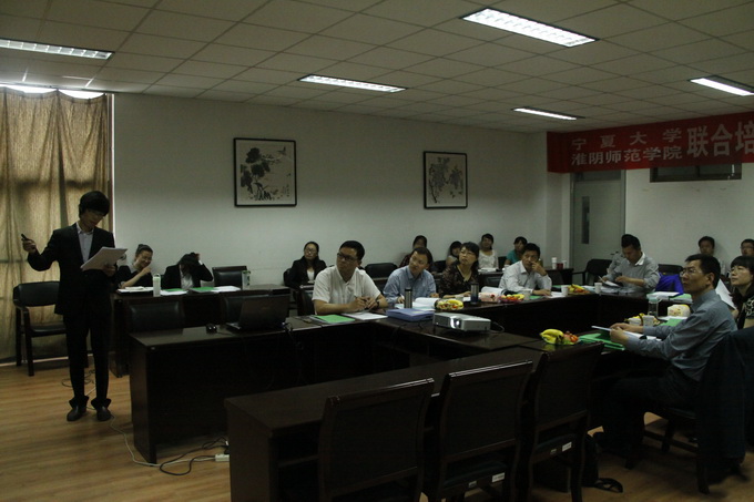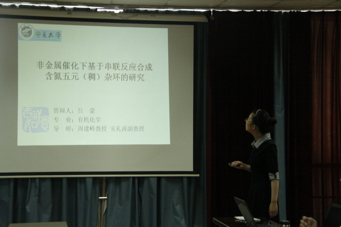 自2010年宁夏大学与淮阴师范学院开展联合培养研究生工作。这四名研究生从上课、学位论文研究到论文答辩全部在淮阴师范学院完成。答辩中,在徐莉教授的主持下,吕蒙、张路路、张敏、寇珊珊四位研究生汇报了硕士研究生期间所做的工作。经过宣讲论文、答辩委员会成员提问、申请人回答、指导教师介绍研究生的基本情况、宣读评阅人对论文的评阅意见、答辩委员会表决、答辩委员会主席宣布表决结果等相关环节,最后四位硕士研究生顺利通过硕士学位论文答辩。