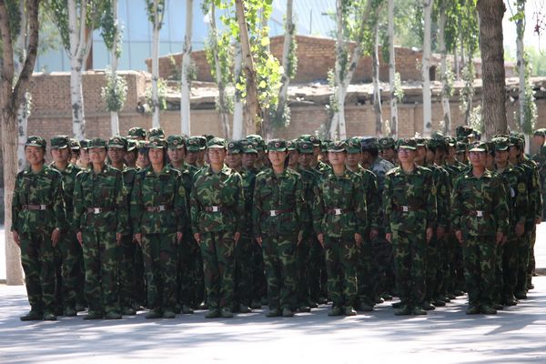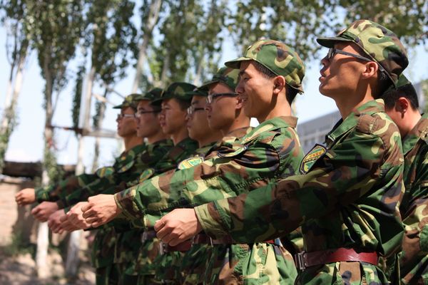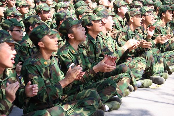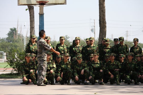 身着戎装,学生新兵英气夺人,势方显。昔日长发昳丽,今弃之,男不得过寸而女束之。紧风纪之扣,系收腰之带。肃军容,严军纪,以会动员,寄希望之。上无掩日之高篷,下无顺脚之碧草,无风无云,汗浸衣而流之,然心志不惑,劳其筋骨,行拂乱其所为,增其所不能而降之以大任。