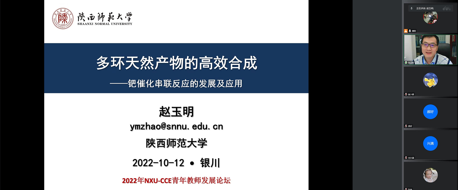 10月12日下午,青年教师协会举办的青年教师论坛第七次活动顺利召开,由于学校疫情防控要求本次论坛活动采用全线上方式进行。本学期采用校外专家和校内青年结合的模式,进一步加强与校外优秀青年的交流与合作。论坛邀请国家自然科学基金优秀青年基金获得者、陕西师范大学赵玉明教授,学院寇贝贝博士和张俊博士作报告,学院50余名青年科研骨干及研究生参与了交流。