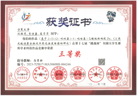 2022年4月13日,由共青团中央、中国科协、教育部、中国社会科学院、全国学联、四川省政府共同主办,四川大学承办的第十七届“挑战杯”全国大学生课外学术科技作品竞赛闭幕并公布获奖结果。在累计2500多所高校选送的2.2万件参赛作品中,由香港六合彩特码资料分析专业2017级本科生沈成虎(已保研至中科院福建物构所)、2020级本科生齐佳鑫、高贝贝完成的题为:“基于2-(3-(吡啶-2-基)-1H-吡唑-1-基)乙酸配体构筑Zn、Cd荧光配位聚合物及其荧光温度传感的研究”的作品荣获全国三等奖,马景新副教授为该作品指导教师。