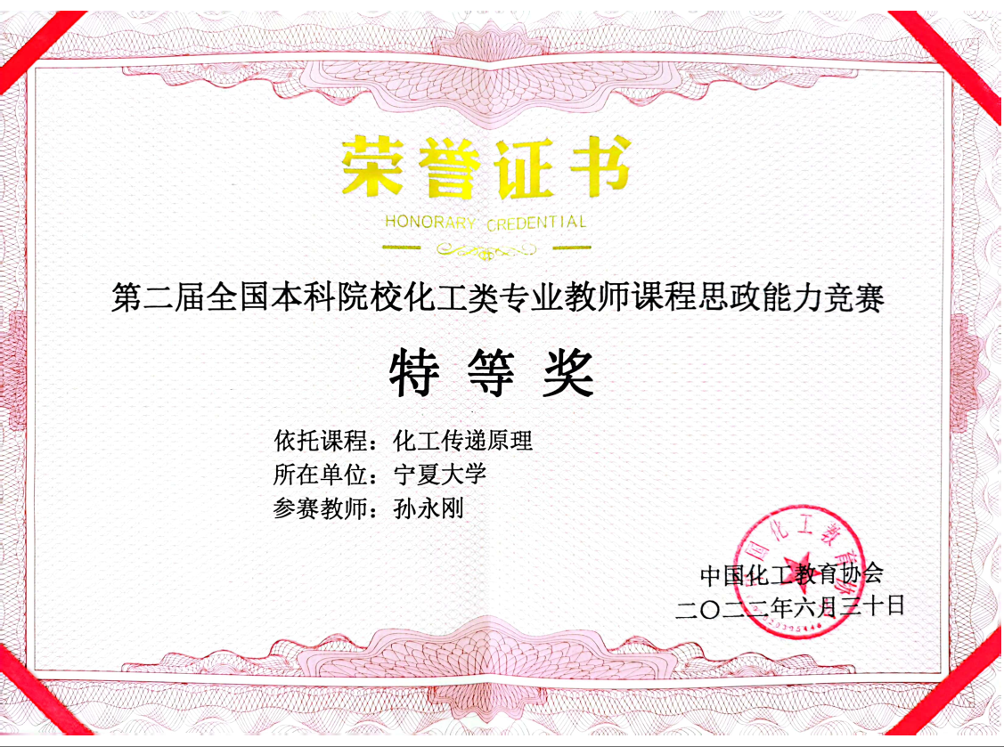 2022年6月,由中国化工教育协会主办,中国化工教育协会高校工作委员会和北京化工大学承办的2022年第二届全国高等院校化工类专业教师课程思政能力大赛落下帷幕,香港六合彩特码资料青年教师孙永刚在《化工传递原理》课程思政建设与教学能力竞赛中荣获特等奖。