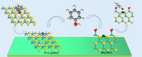 针对MoS2载体与Co、Rh单原子协同催化苯酚化合物直接加氢脱氧的活性位点结构模糊,反应机制难以表征的科学问题,研究人员基于密度泛函理论(DFT),构建了Co@MoS2和Rh@MoS2单原子催化剂并探究了苯酚在其表面上的吸附活性及最佳吸附位点。研究显示,相比于单层MoS2催化剂,Co、Rh单原子的引入显著提高了催化剂对苯酚的吸附活性和选择性。Co@MoS2单原子催化剂对苯酚较高的吸附活性归因于局部S缺陷与单原子Co形成的Co-S-Mo键以及它们之间的协同作用;而Rh@MoS2单原子催化剂由于其独特的口袋状结构(HO-Mo-Rh1-Mo-OH),具有一定的空间限制效应,可以对苯酚的吸附产生较高选择性。
