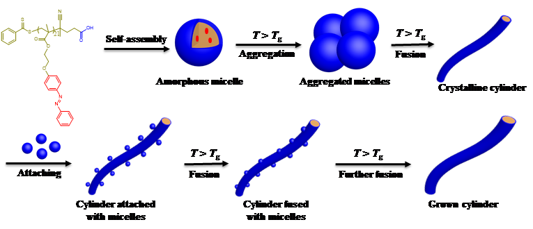 纳米材料形貌、尺寸的精确调控具有重要意义,但是仍然存在巨大挑战。孙辉团队与同济大学杜建忠教授合作,首次提出了结晶驱动融合诱导粒子自组装的新方法,实现了柱状胶束的活性横向生长,为一维纳米材料的横向活性生长提供了新思路。