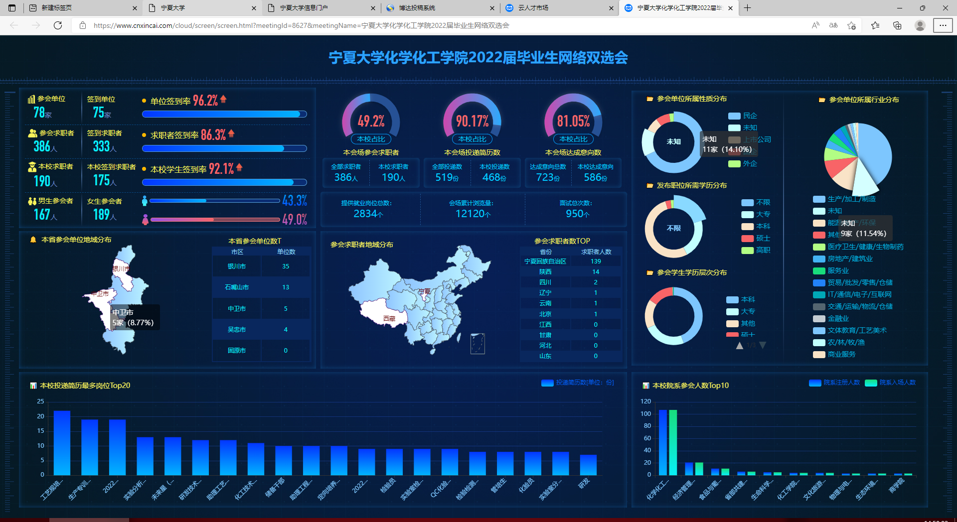 2022届毕业生踊跃参加线上应聘,积极调节求职心态,主动向用人单位推荐自己,展现化院学子积极、向上、自信、文明的精神风貌,各用人单位对香港六合彩特码资料学生给予了很高的评价。先后有500余人线上求职,投递简历468份,947人次与用人单位洽谈面试,385人次与用人单位达成初步求职意向。双选会还吸引了生命科学学院、土木与水利工程学院、经济管理学院、农学院、信息工程学院等兄弟学院的部分毕业生参加。
