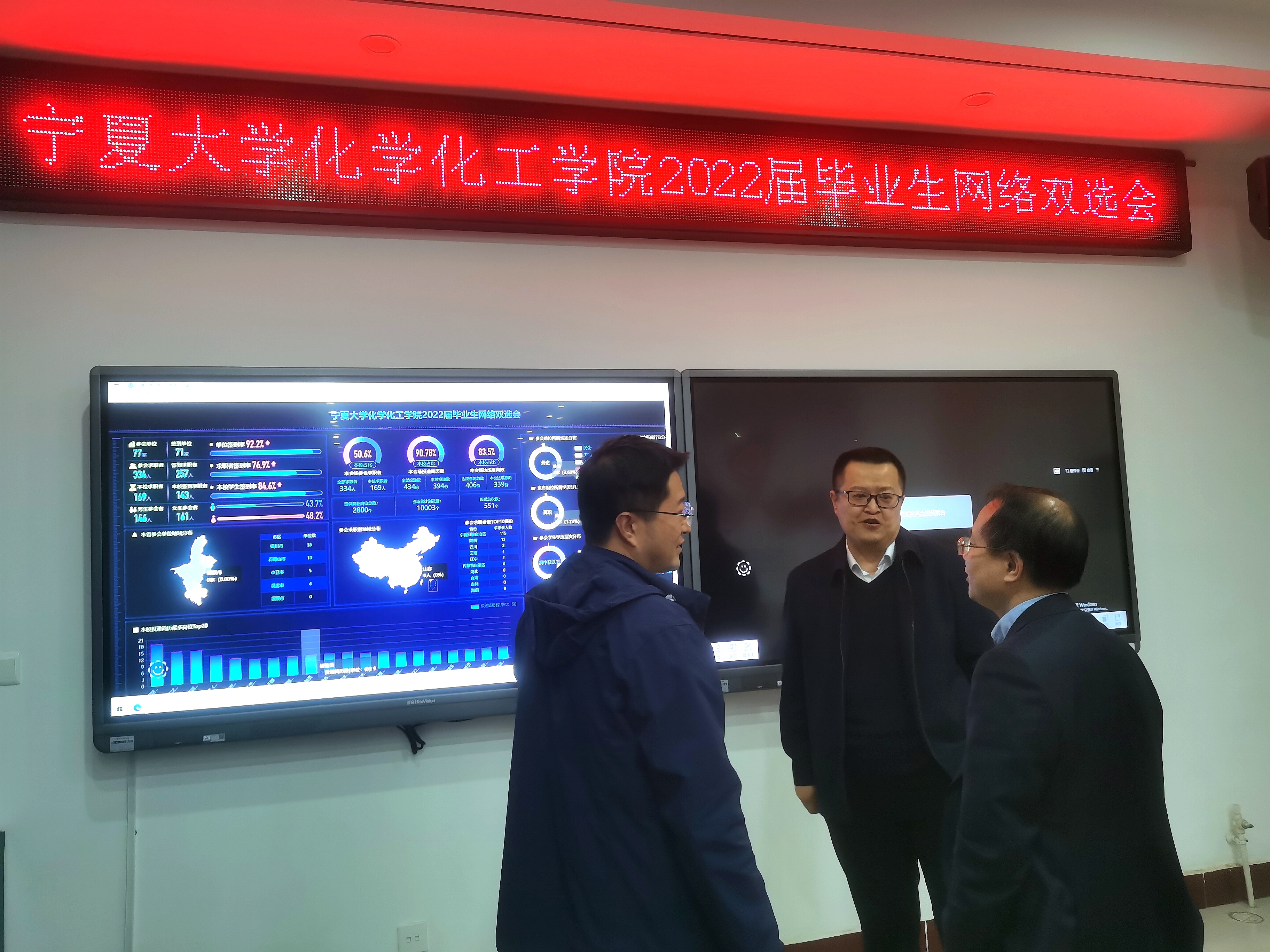 院长罗正鸿,学院党委书记高继明莅临网络双选洽谈会现场,了解招聘情况,指导网络双选洽谈会。
