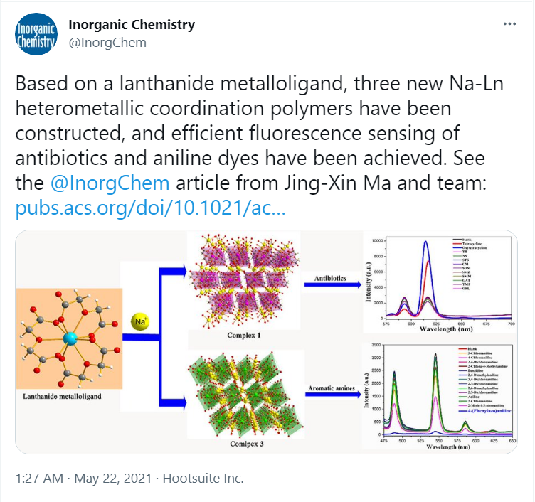 近日,香港六合彩特码资料马景新课题组在有机污染物荧光检测研究方面取得了新进展,研究成果发表于国际知名期刊《Inorganic Chemistry》。论文题目:“Na-Ln Heterometallic Coordination Polymers: Structure Modulationby Na+ Concentration and Efficient Detection to TetracyclineAntibiotics and 4‑(Phenylazo)aniline”,DOI:10.1021/acs.inorgchem.1c00462。