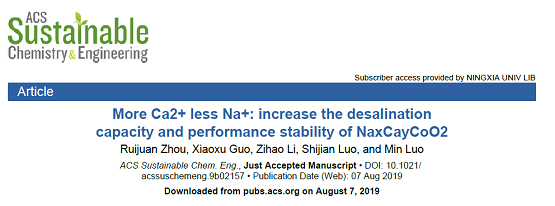 (省部共建煤炭高效利用与绿色化工国家重点实验室)罗民教授负责的能源和环境材料研究团队,在电化学盐水淡化研究方面取得重要研究进展。研究成果在线发表在美国ACS数据库国际可持续化学与工程领域Top期刊《ACSSustainable Chem. Eng》(一区,ImpactFactor 2018: 6.97)。论文题目:“MoreCa2+ less Na+: increase the desalination capacity andperformance stability of NaxCayCoO2”;DOI:10.1021/acssuschemeng.9b02157.宁夏大学罗民教授为本文的通讯作者,2018级水资源利用与化学化工博士研究生周瑞娟同学为论文第一作者。
