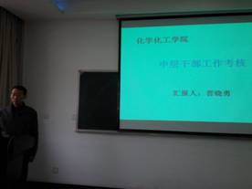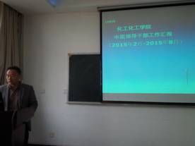 自从2013年5月以来,为了将学院的管理服务工作做得更完善,学院分设了院长助理、化学系主任、化工系主任等八个中层领导岗位,聘请了李学强、张晓光、晋晓勇等八位老师担任相关职位。本次会议八位中层领导以PPT方式从岗位职责、任期两年以来所做的具体工作以及工作中所面临的问题等方面做了详细的陈述总结。
