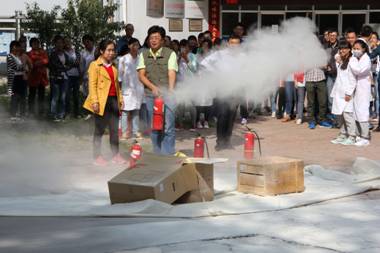 演练中,随着一声哨响,拟发火灾现场的师生,在义务消防员老师的组织下迅速从安全通道有序地逃离火灾现场;任建林副院长给全体师生讲述消防安全的重要性和发生火灾事故后的基本扑救方法、逃生技能等;刘万毅院长从化学的角度解读了灭火器灭火的基本原理等,强调了提高安全意识,训练处理火灾事故技能的重要性。保卫处贾鹏科长对如何报火警等做了培训,并重点演示了灭火器的使用技巧。最后全体实验技术人员和部分师生亲自使用了灭火器。