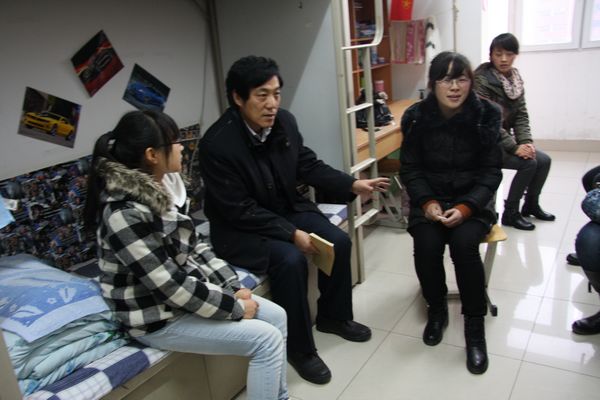 在15号楼学生公寓,许校长看望了化工学院2010级李山、2011级王海哲同学。李山同学早年父母离异,后母亲病逝,与弟弟相依,成为孤儿;王海哲同学来自宁南山区,单亲家庭,家里孩子多,经济十分困难。许校长仔细查看了学生的住宿条件,亲切地询问同学们“是否适应大学的生活?学习、生活有没有困难?”,他进一步向辅导员了解化工学院贫困生比例和接受学校助学金资助情况,要求辅导员要深入学生,把工作做细。许校长鼓励贫苦生要勇于克服困难,坚持把学习搞好。