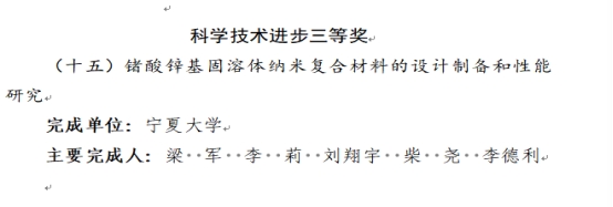 《锗酸锌基固溶体纳米复合材料的设计制备和性能研究》:项目基于半导体能带设计理论,提出采用绘制(赝)三元相图法探寻锗酸锌基固溶体(区)的思路,设计制备了一类全新的锗酸锌基固溶体光催化剂,在常温下,有效提高了光还原CO2制碳基燃料的转化效率。该研究确定了控制锗酸锌基固溶体光催化材料功能和光催化反应过程的重要组成和结构因素;阐明了锗酸锌基固溶体光催化剂光致电荷转移过程和影响活性的关键因素;揭示了不同组成和电子结构的锗酸锌基固溶体光催化剂的光催化协同作用机制;该研究为CO2还原高效光催化材料的设计制备、改善半导体光催化性能实验方法的建立以及CO2光还原转化的实际应用提供了理论支持。通过项目研究,发表高水平论文9篇(累计影响因子99.34),授权专利1项,培养硕士研究生3名,其中1名硕士研究生论文被授予宁夏回族自治区优秀硕士学位论文。