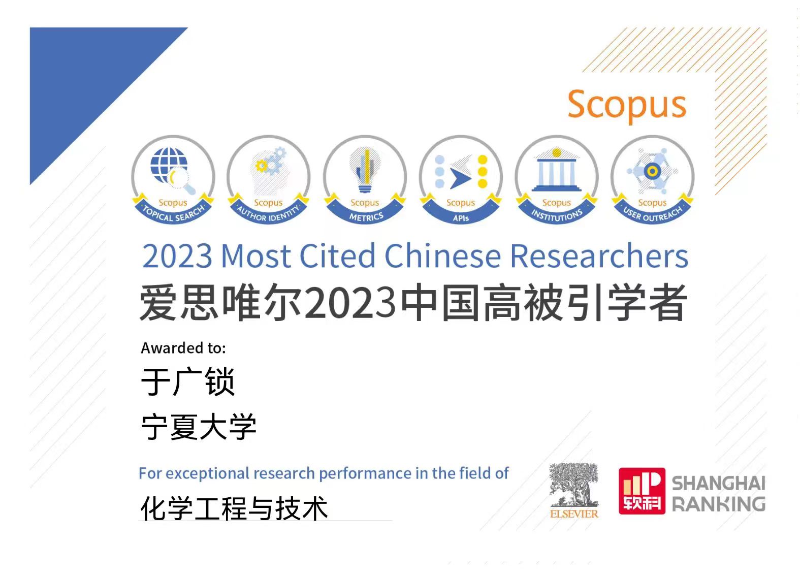 于广锁教授入选“化学工程与技术”领域高被引学者榜单。这是于广锁教授自2018年入职宁夏大学以来第三次入选,标志着我校一流学科“化学工程与技术”的科研水平和影响力逐年持续提升。