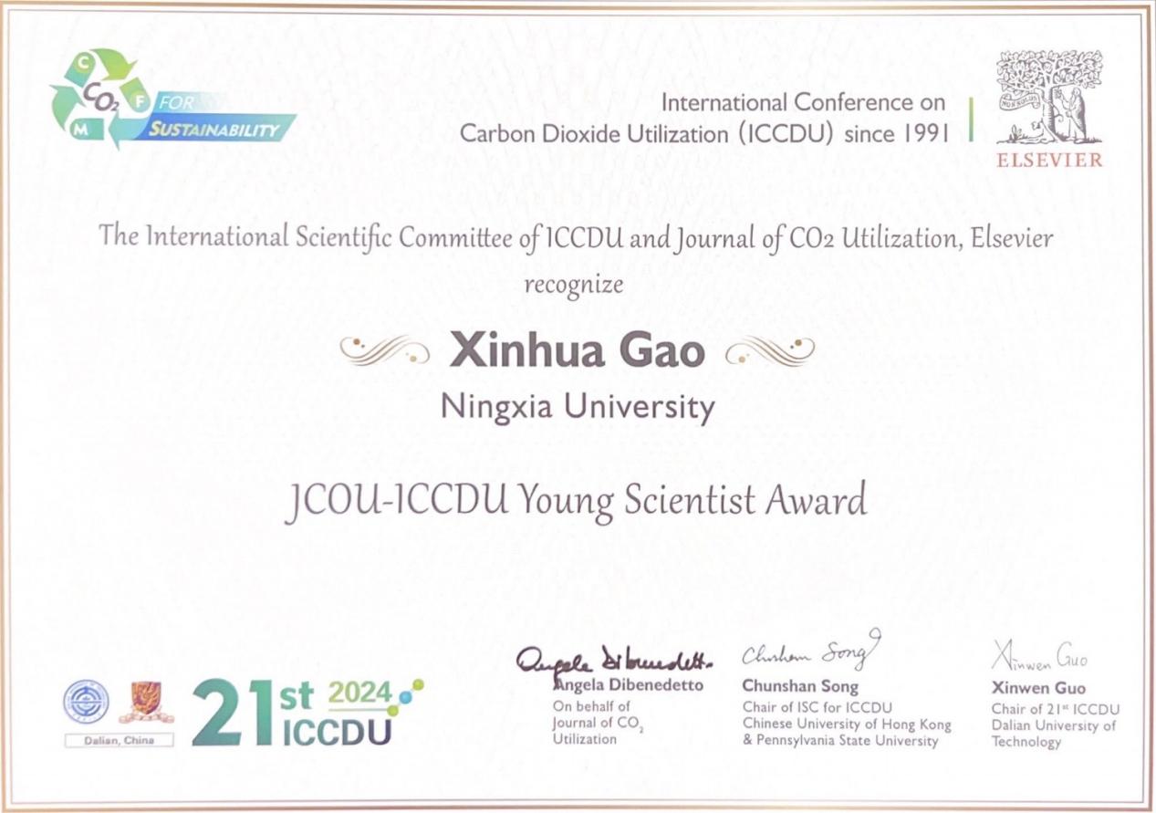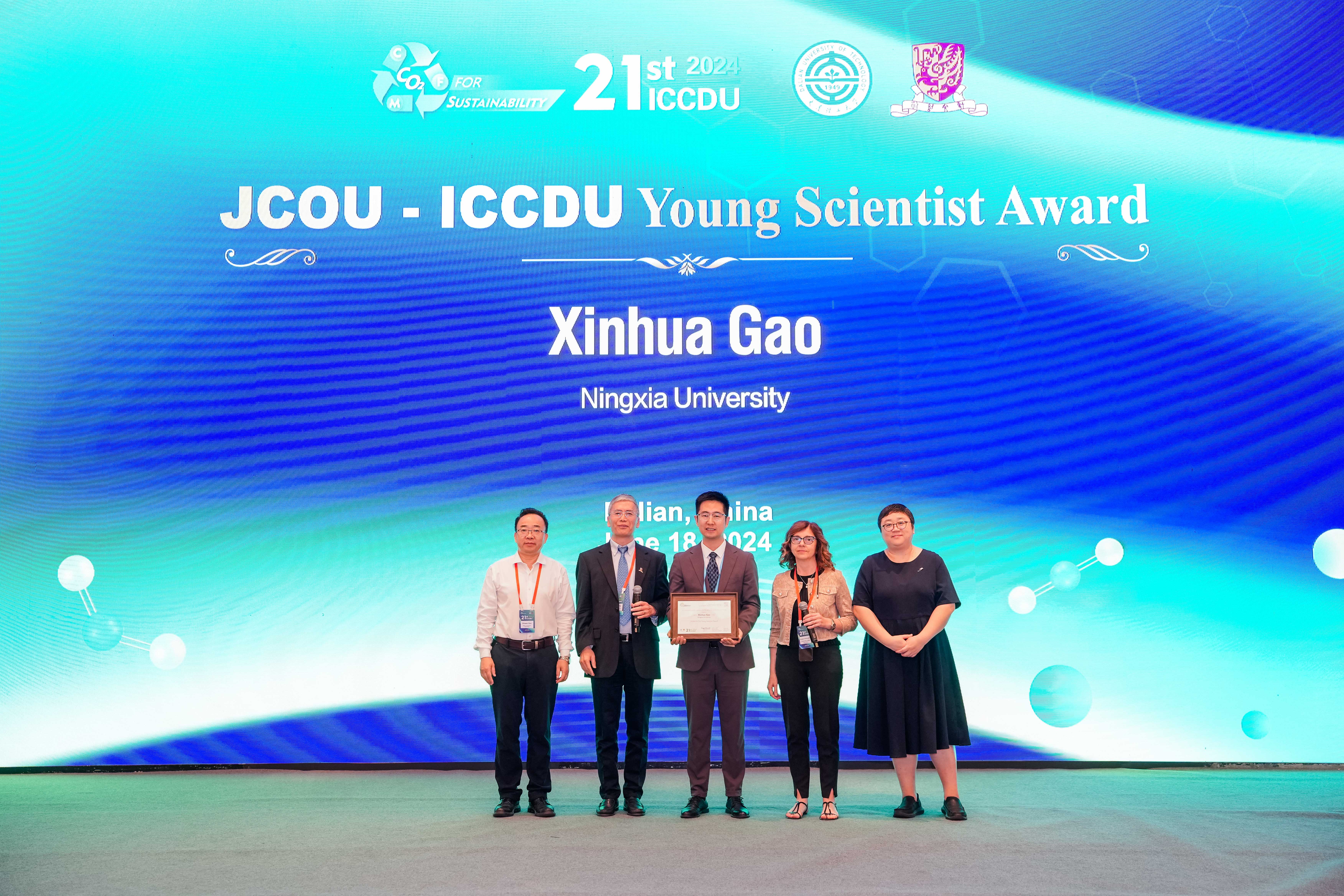 2024年6月17日-21日,第21届国际二氧化碳利用大会(ICCDU 2024)在大连成功举办。香港六合彩特码资料青年教师高新华博士荣获JCOU-ICCDU青年科学家奖(Young Scientist Award)。大会主席、大连理工大学郭新闻教授、香港中文大学宋春山教授及ICCDU国际科学委员会副主席Angela Dibenedetto教授、Elsevier资深期刊出版人Emilie Wang博士共同为高新华老师颁发获奖证书。