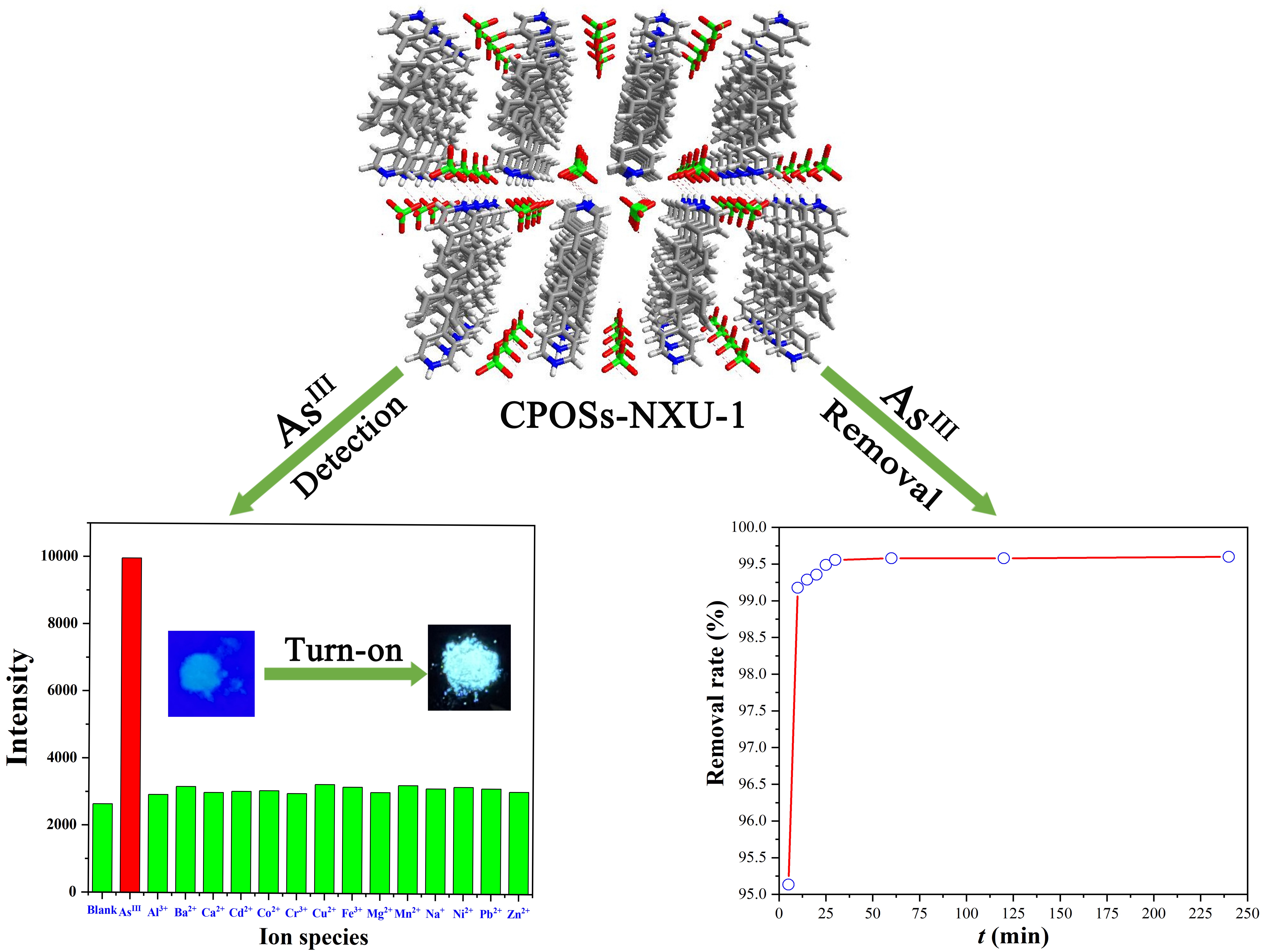 本项工作以“一站式”解决水体砷污染为目标,通过构筑具有优异荧光性能和稳定性的晶态多孔有机盐(CPOSs-NXU-1),实现了对水体中痕量三价砷物质的高灵敏荧光检测和高效率吸附清除。本工作为以性能为导向的晶态多孔材料精准构筑提供了新的思路。此外,基于本项研究所获得的材料和技术已申请国家发明专利。
