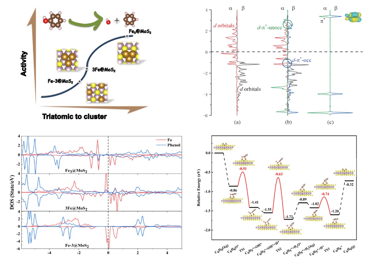 本研究中,研究人员创新性地设计了Fe3@MoS2催化剂,并通过密度泛函理论(DFT)计算深入剖析了Fe3团簇上C-O键直接断裂的电子转移和活化能垒。他们发现,一种独特的活化机制在此过程中发挥了关键作用,即d-π轨道的形成与占据,这一机制极大地促进了电子从Fe3的d轨道向酚类C-O键的π轨道转移,从而显著降低了反应能垒。