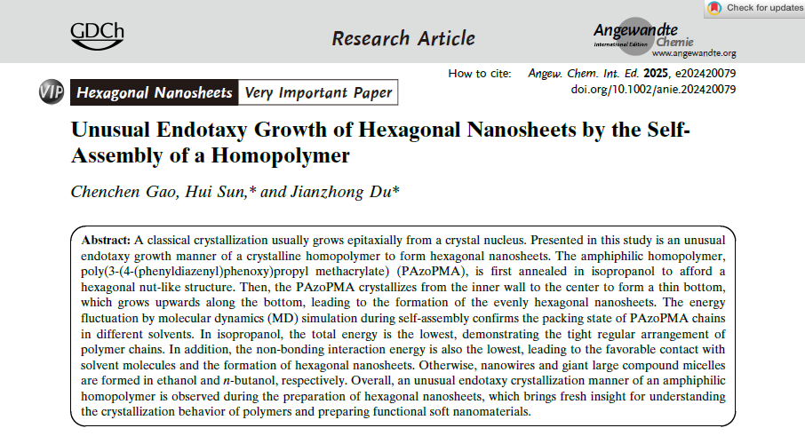 孙辉博士在高分子自组装研究领域取得进展。该工作以“UnusualEndotaxyGrowth of Hexagonal Nanosheets by the Self-Assembly of a Homopolymer”为题发表在国际顶级期刊《Angew. Chem. Int. Ed.》,并被选为Very Important Paper。该论文第一作者为硕士研究生高晨晨,孙辉博士为通讯作者,宁夏大学为第一完成单位。