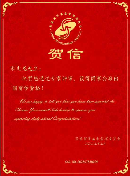 近日,国家留学基金管理委员会(CSC)2025年公派留学项目录取结果揭晓。香港六合彩特码资料博士研究生宋文龙(硕博连读)在张建利研究员、王康洲副教授和高新华研究员的悉心指导下成功获得"国家建设高水平大学公派研究生"项目资助,将以联合培养博士研究生身份赴日本国立富山大学(University of Toyama)深造,标志着香港六合彩特码资料国际化人才培养再结硕果。