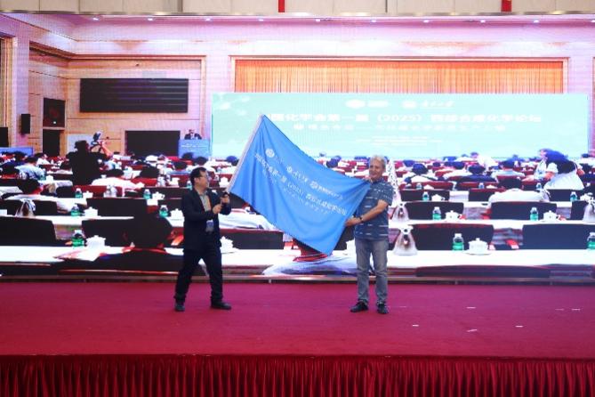 闭幕式由本次会议秘书长、宁夏大学涂涛教授主持。涂教授宣读了墙报奖获奖名单,并邀请全程参会的5位院士为获奖者颁奖。10位分别来自宁夏大学、贵州大学、南开大学、复旦大学、四川大学和香港浸会大学的青年学者荣获奖项,并现场获颁荣誉证书及奖品。闭幕式上,会议正式宣布第二届(2027)西部合成化学论坛将由新疆师范大学承办,并进行了会旗交接仪式。