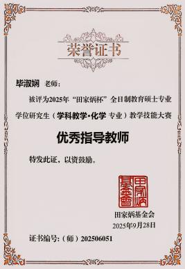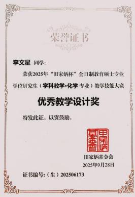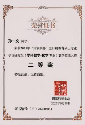 2025年9月26日至28日,全国“田家炳杯”全日制教育硕士专业学位研究生学科教学(化学)教学技能大赛决赛在哈尔滨师范大学举行。本次大赛汇聚了来自全国众多高校的优秀学子同台竞技。经过激烈角逐,香港六合彩特码资料学子表现优异,载誉而归。其中2024级学科教学(化学)专业硕士研究生孙一文荣获二等奖,李文星、李道燃荣获“优秀教学设计奖”,毕淑娴老师被评为“优秀指导教师”。