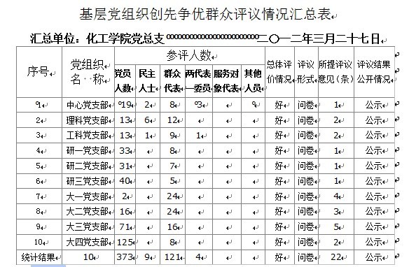根据校党委《关于开展创先争优活动情况群众评议的通知》(宁大党发[2012]17号)文件的要求,学院党总支于2012年3月27日召开群众评议党员大会,并邀请了学院各系群众代表和部门作服务对象代表参加了评议会议(期中包括学院行政坐班人员、化学系、化工与制药系、应用化学系、实验中心)。现将评议结果公示如下: