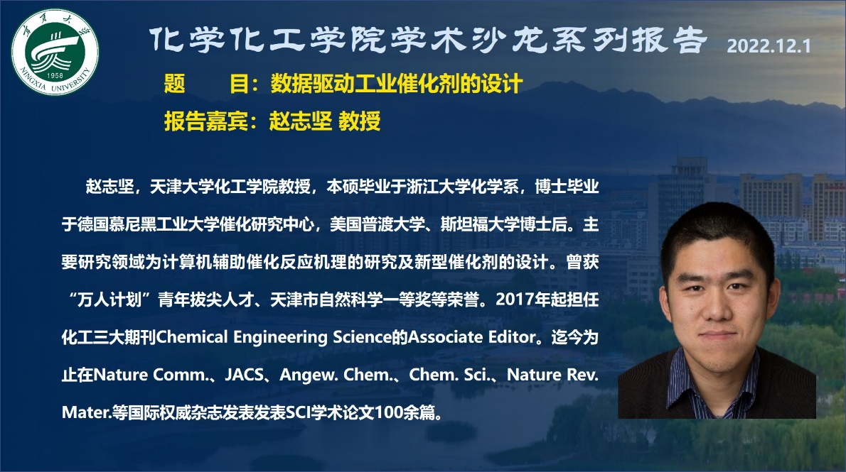2022年秋季第十二次学术沙龙报告会在线上举行。天津市自然科学一等奖获得者,天津大学赵志坚教授做了题为“数据驱动工业催化剂的设计”的报告。学院部分青年教师及研究生、本科生近160人参加了此次学术活动。报告会由香港六合彩资料网站