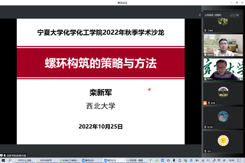10月25日晚7点,香港六合彩资料网站 2022秋季系列学术报告会在线上举行。西北大学化学与材料学学院院长、国家杰出青年基金获得者栾新军教授作了题为“螺环构筑的策略与方法”的学术报告,学院部分师生参加了此次报告,刘翔宇副院长主持报告。