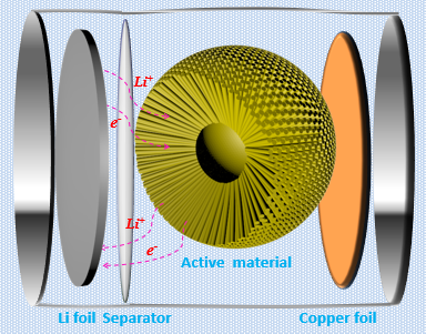据了解,对于能量存储器件锂二次电池来说,如何进一步提高锂离子电池负极材料的电容量、循环寿命和综合使役性能仍然面临巨大挑战。近年来,一些非碳基材料由于具有高的比容量,特别是体积比容量以及较低的脱/嵌锂电位,已成为当前锂电池负极材料研究的一大方向。最近,该课题组以乙酸钴、乙酸锌和GeO2为原料在TEOA的碱性溶液中,采用湿化学法成功制得了1-D纳米棒自组装的3-D CoxZn2-xGeO4空心纳米球,组装成锂离子扣式半电池(示意图见下图)。通过x值调变系统研究了不同钴掺杂量的CoxZn2-xGeO4的电化学储锂性能。发现在最佳Co/Zn比和1000 mA g-1的电流密度下,循环100周后其可逆放电容量仍保持在882 mA h g-1。