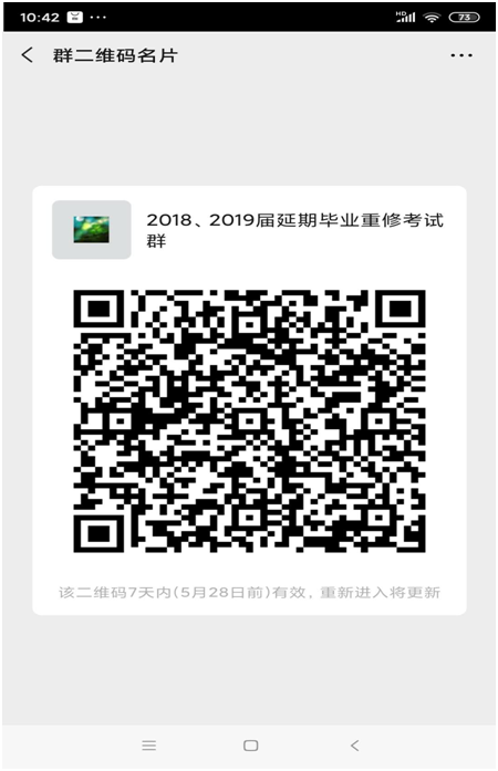 各位2018、2019届延期毕业生,为方便通知大家重修课程考试安排,请大家扫码进入2018、2019届延期毕业重修考试微信群,入群请标明年级及姓名,考试相关重要信息均在群中发布。